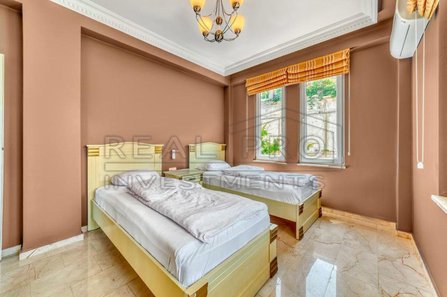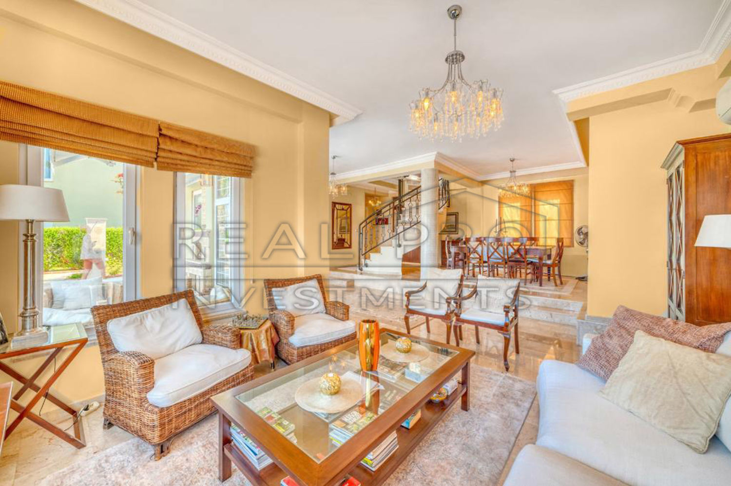- The duplex villa is laid out as follows: a large living room with a semi-open kitchen, three bedrooms, three bathrooms and two open balconies, the design of the villa was made according to an individual project and amazes with its richness and grandeur, the bright interior harmoniously combines elements of gold, wood, marble, luxury crystal chandeliers, mirrors, lampshades, paintings and decorative designer items