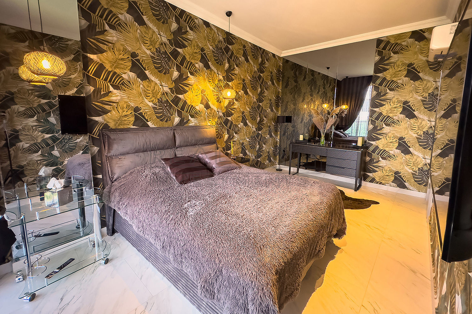 - The stylish living room, with original wallpaper on the walls and an exclusive chandelier, features a comfortable corner sofa and a round table with trendy upholstered chairs, the functional, compact kitchen is equipped with the latest technology, the bedrooms are beautifully furnished with large beds and fashionable bedside tables in both rooms