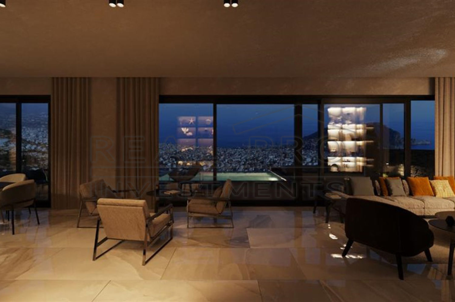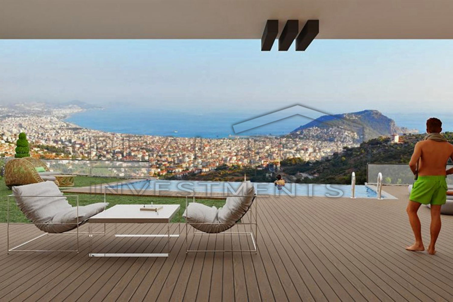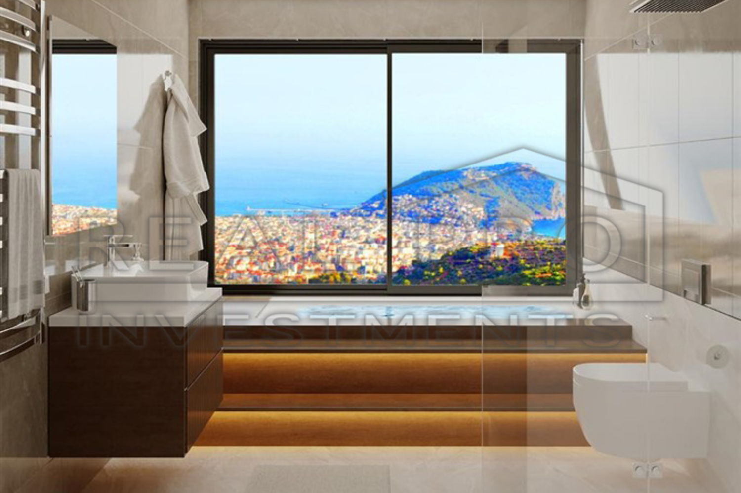 - Each three-storey villa has four bedrooms, the total area is 315m², the net living space is 255m². Behind an impressive facade of glass and natural stone is a house thought out to the last detail. Large panoramic windows with automatic shutters provide natural and very pleasant lighting. From every floor of one of these four magnificent villas you have a wonderful open view of the Mediterranean Sea and the castle of Alanya, and of course of Alanya city, which is particularly impressive in the evening.