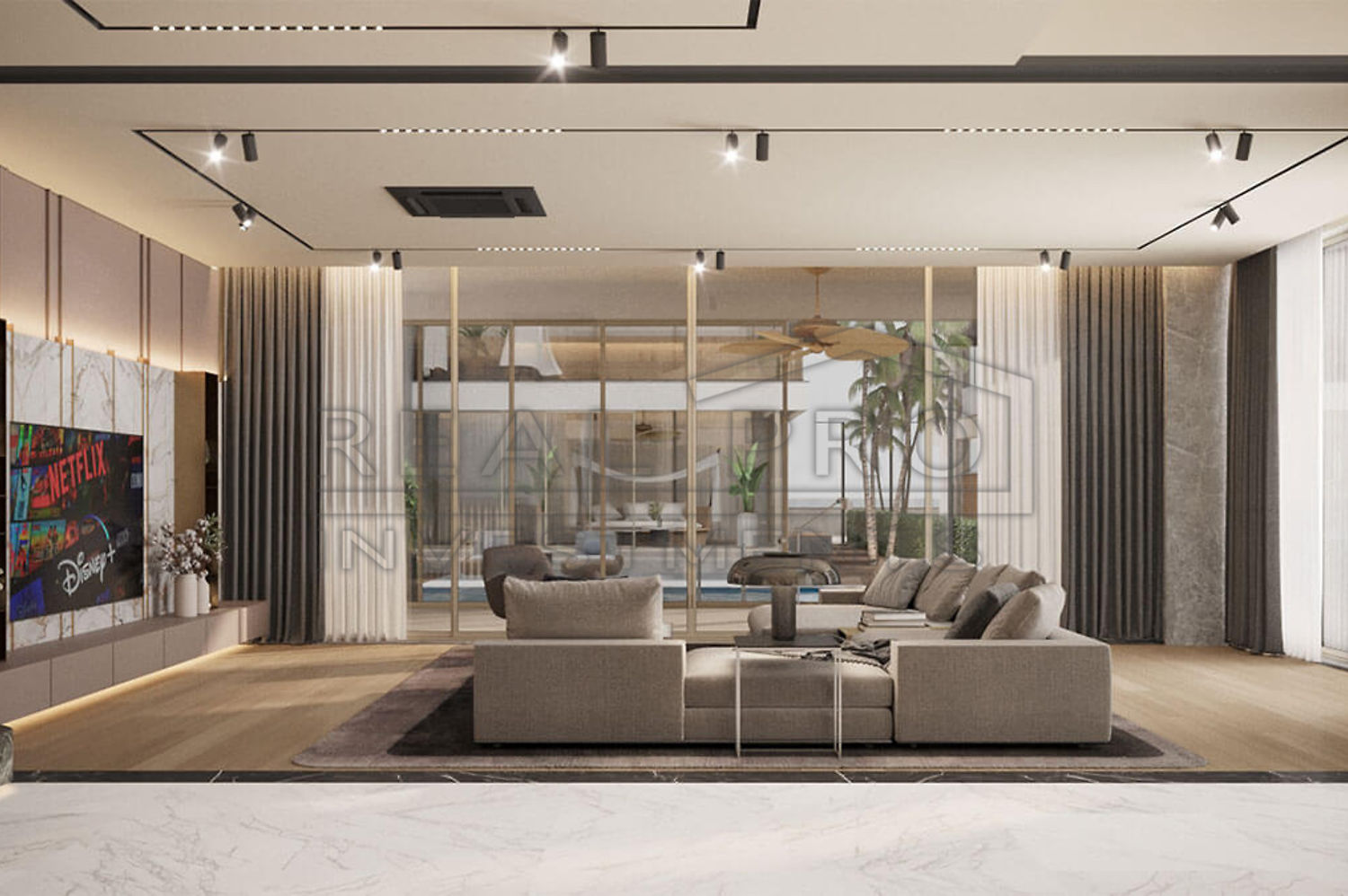 - The villas have a generous living space of no less than 400 m², consisting of a large living room, a separate kitchen and four bedrooms with en-suite bathrooms, each villa has direct access via the terrace to the large swimming pool that runs through the entire residence