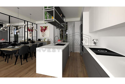 • The built-in open kitchen is already equipped with basic appliances such as a hob, oven and cooker hood; you can have a bite at the cosy breakfast bar