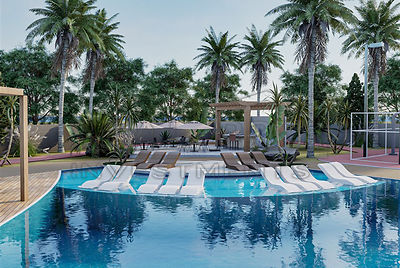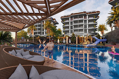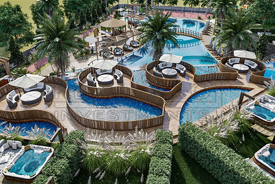 - Special attention is being paid to the internal infrastructure, which is quite impressive: a large outdoor pool with sun terraces and an aqua park, a heated indoor pool, of course there is also a children's pool and a playground for the little ones, cozy seating areas in the garden, a SPA area with sauna, Turkish bath and fitness, tennis court, mini cinema, etc. Interesting detail: wifi will be available throughout the residence.