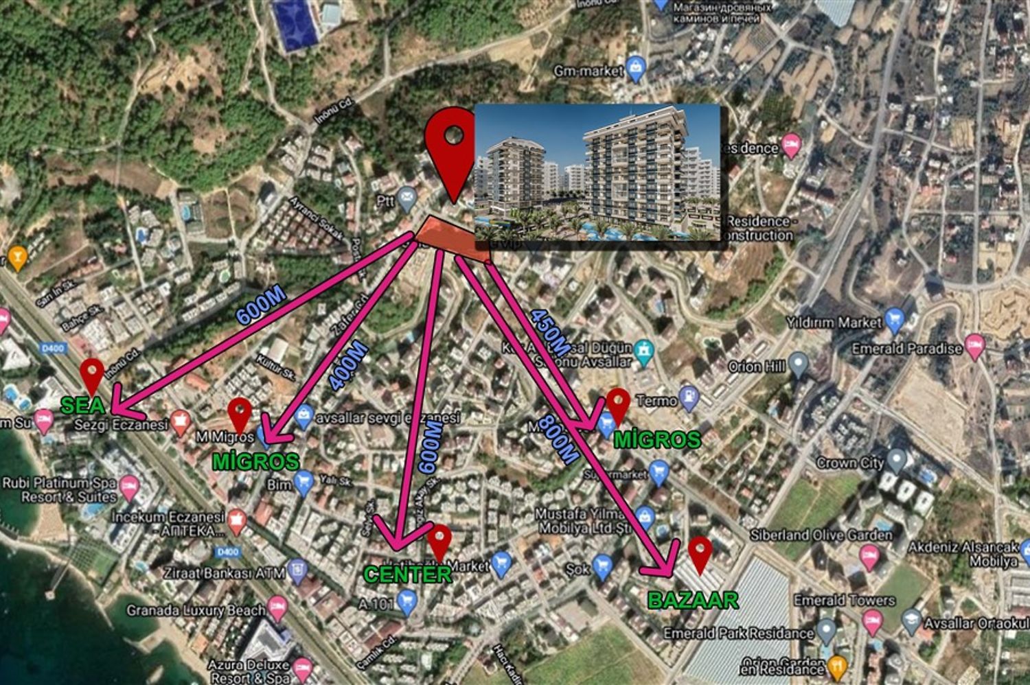 - New flats in Avsallar Alanya only 600 metres from the beach and 400 metres from the centre so that everything for a comfortable life is at hand within walking distance