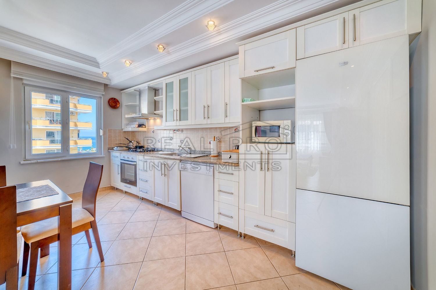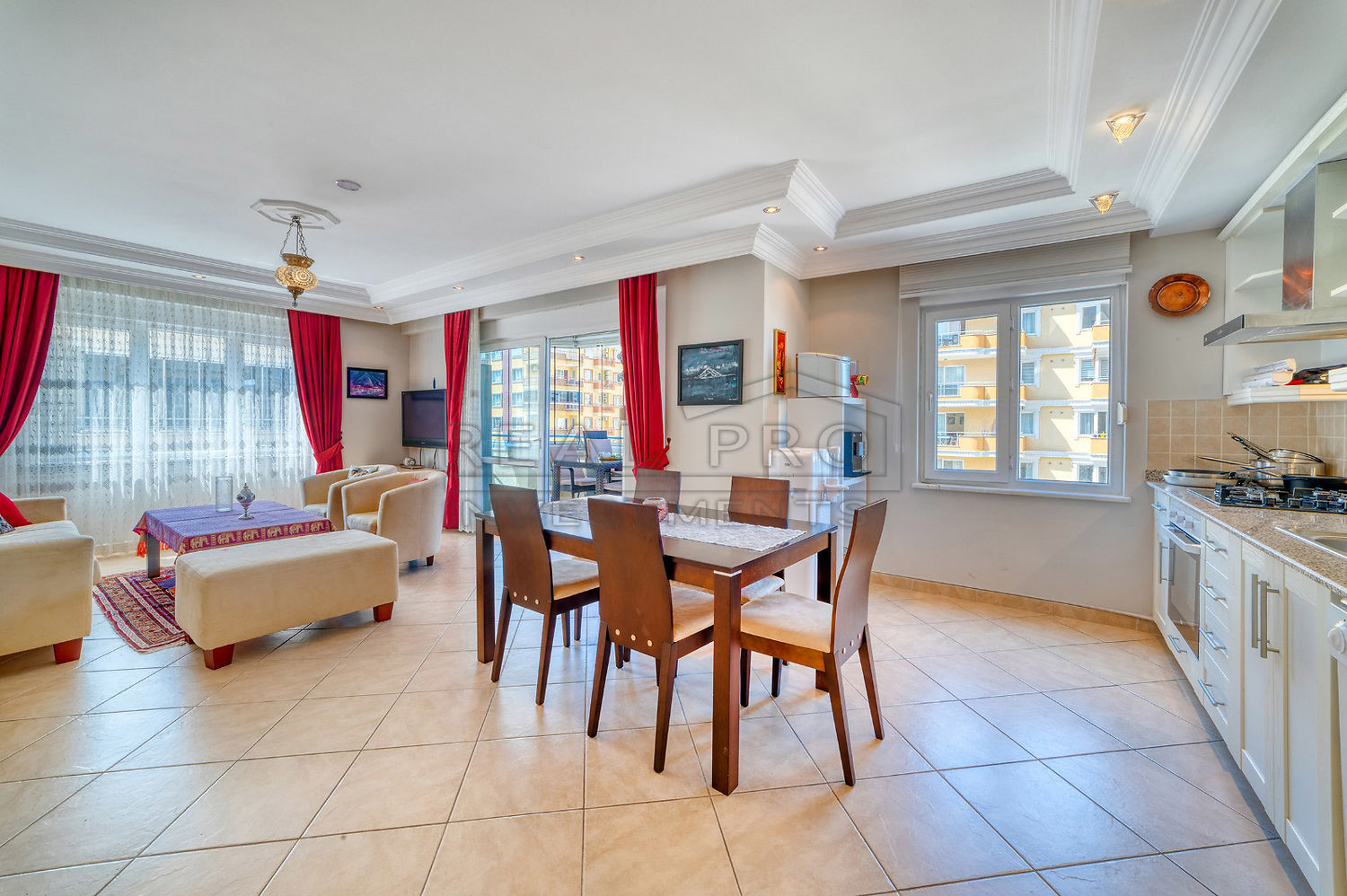 - The flat is tastefully decorated and the spacious living room with open kitchen provides access to the large balcony - which has sliding glass windows and plenty of room for a dining and sitting area - so you can enjoy the beautiful weather and the lovely climate of the Turkish Riviera in both winter and summer