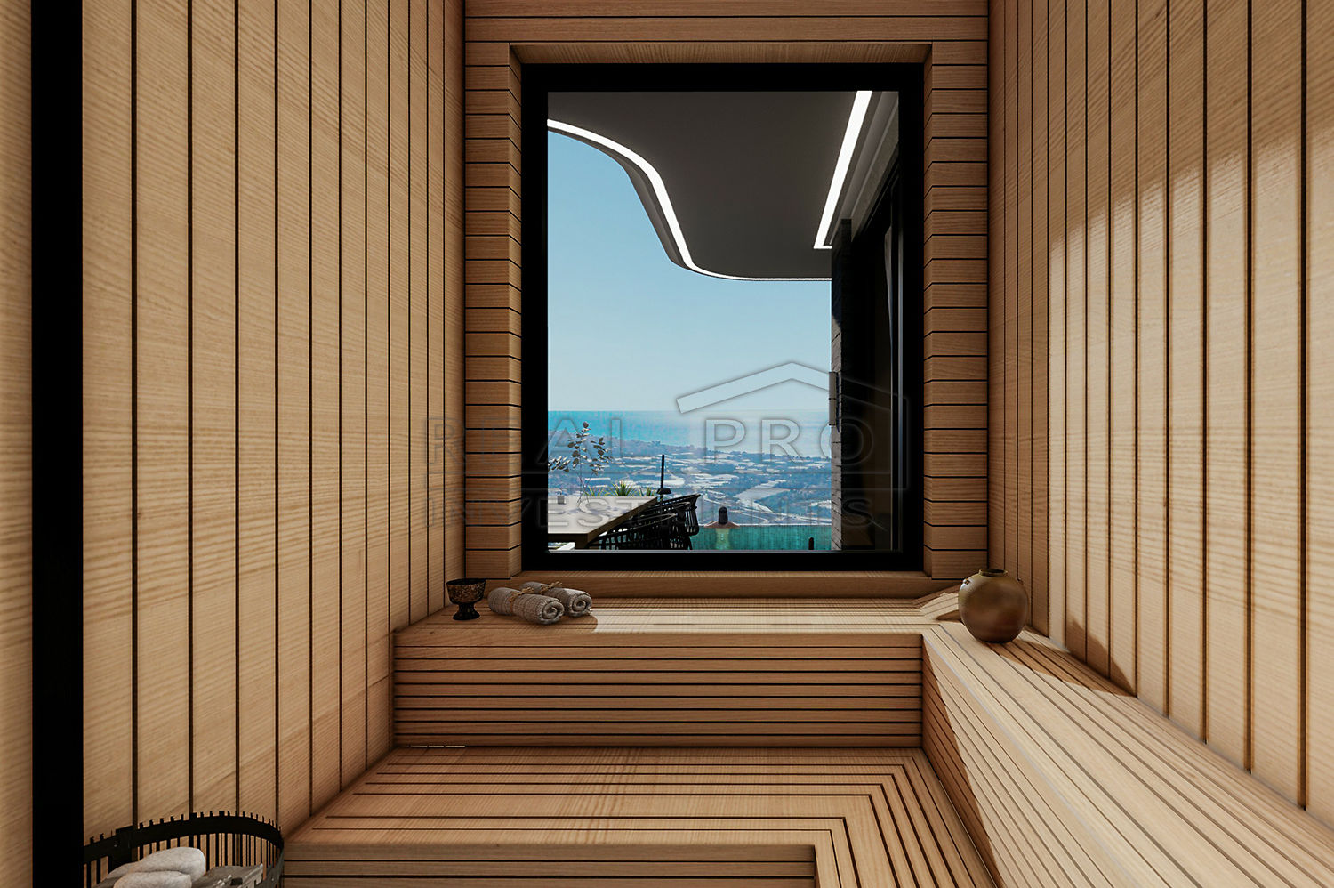 - In addition, the villa has a large private covered parking space with ample space for several cars, a lift to the living area, a private sauna and a private Roman steam bath. The villa is perfectly finished with materials of the best quality and is equipped with a modern fitted kitchen, LED lighting and fully fitted design bathrooms, the large windows provide plenty of light and allow you to constantly enjoy the wonderful view.