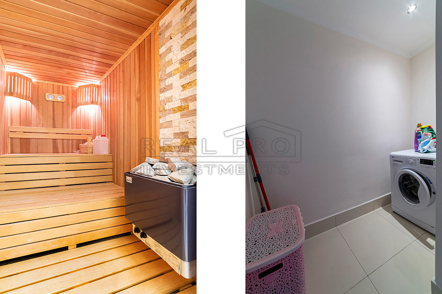 - The complex distinguishes itself not only by its excellent quality but also by its various facilities such as a large swimming pool with slides, a Jacuzzi and a shallow area where your lounger can stand in the water and provide the necessary refreshment on a hot summer day, you can order a drink at the poolside bar, this luxury residence in Alanya also has a SPA centre with a heated indoor swimming pool and Turkish bath, Roman steam bath, sauna and massage, for the sporty among you there is also a gym and a tennis court, you can relax with a game of ping-pong or billiards, the little ones get their money's worth in the children's pool, the playground or the playroom for a rare rainy day