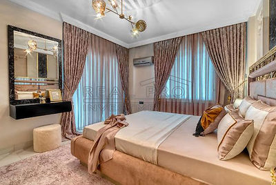 - The master bedroom is decorated in a rich classical style, with peach tones in the interior, mirrors and elegant stucco on the walls, the room is equipped with a large, comfortable bed, bedside tables, a chest of drawers and a wardrobe, the furnishing of the children's room is also original and will certainly appeal to the new owners; there are also stylish compact beds, a wardrobe and a bedside table