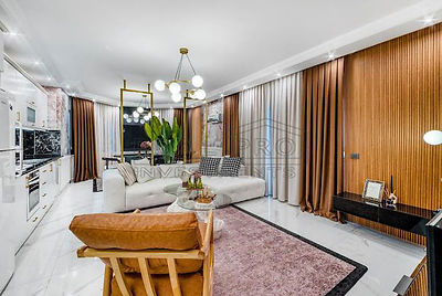 - The flat has undergone a stylish design renovation, modern furniture and new household appliances have been installed, in the interior, white is successfully combined with amber shades, and soft lighting on multiple levels, fashionable prints on the walls, wood decoration, velvet and satin textures and exclusive decorative items create an atmosphere of luxury and abundance