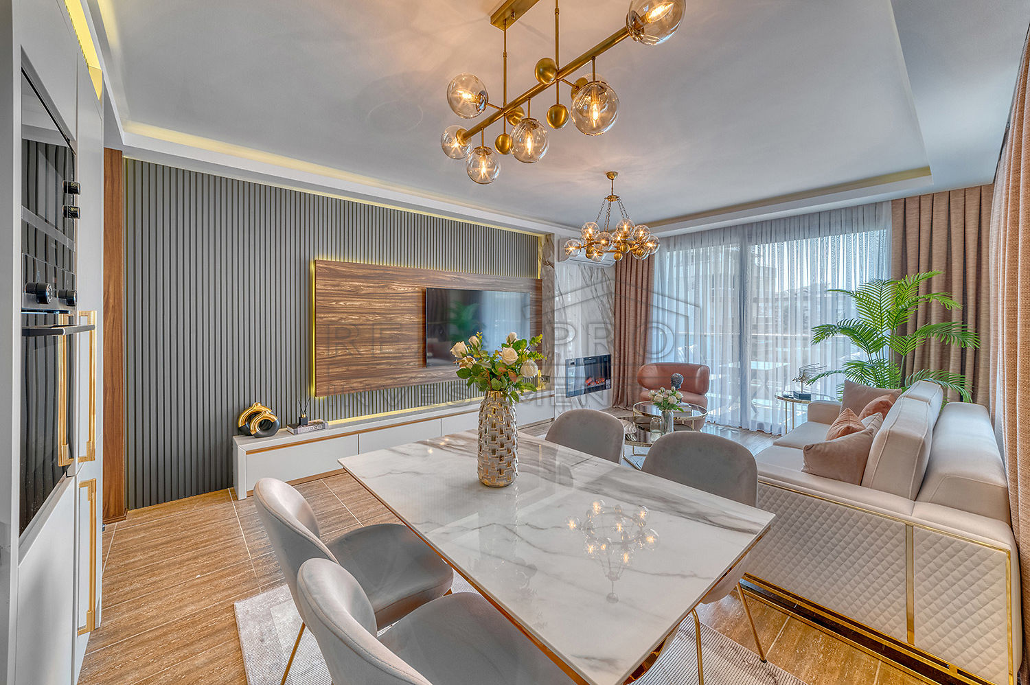 - Beautiful luxury flat with a total area of 110 m² with two bedrooms and a cosy living room combined with an open kitchen, located on the second floor of a premium complex built in 2012 in Oba Alanya