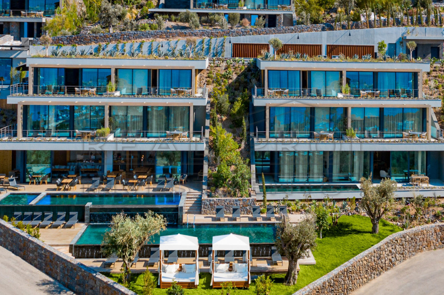 - All apartments and villas in this magnificent residence in Yalıkavak offer stunning views both from the living room and from the bedrooms, there is a choice of six or seven bedroom villas - of course with en-suite bathroom - and an additional family bathroom and a separate guest toilet, all villas - with private swimming pool and a very large terrace - have a surface area varying between 1070 and 1115 m² depending on the type, here you can find more info about the two and three bedroom flats