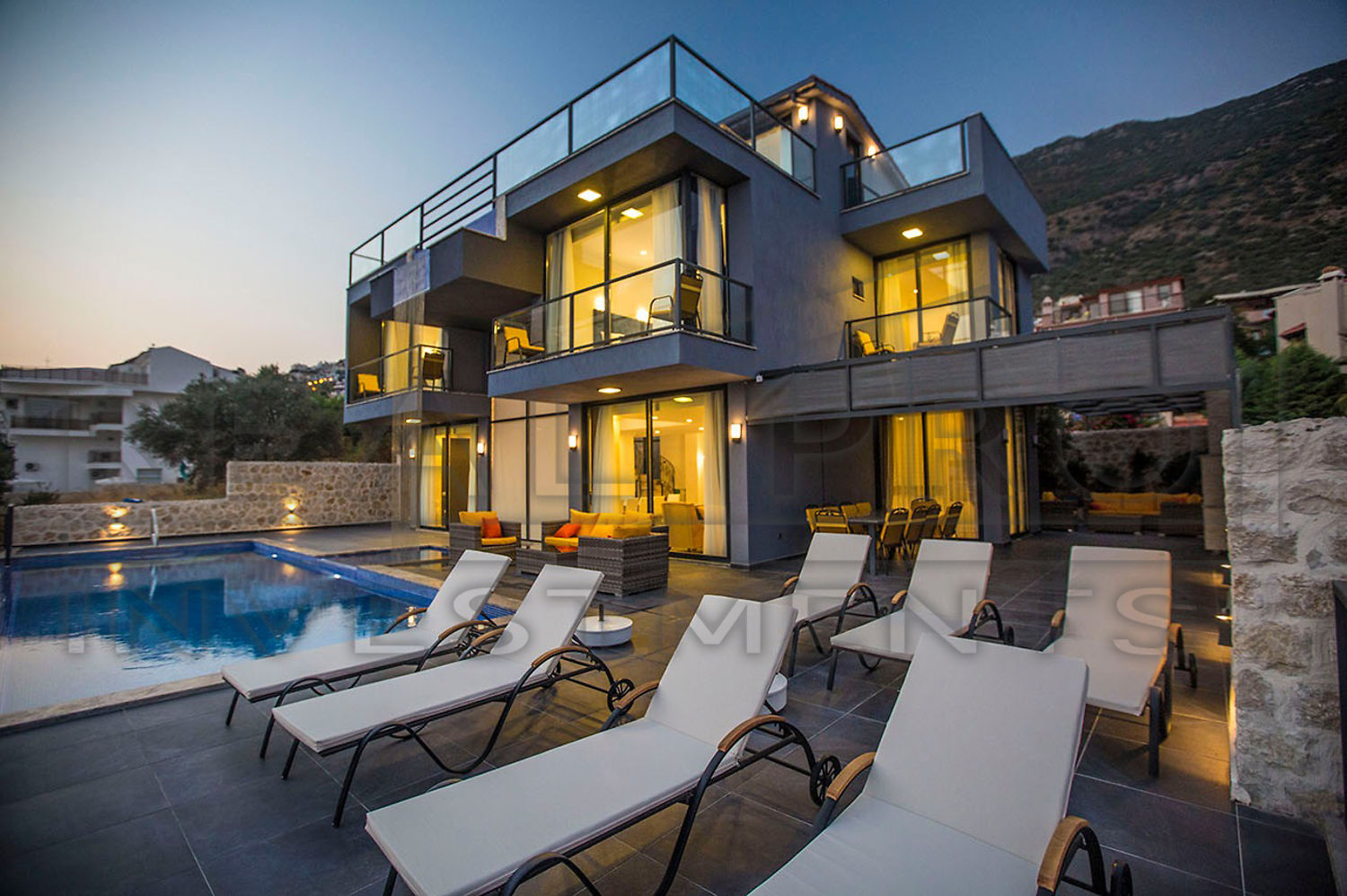 - Splendid modern Kalkan villa with four bedrooms and private swimming pool, peaceful yet central location close to Kalkan centre and within walking distance of shops and supermarkets, fantastic panoramic views of the bay and the Kalkan Islands from almost all rooms, the hillside location provides a refreshing sea breeze during the hot summer months