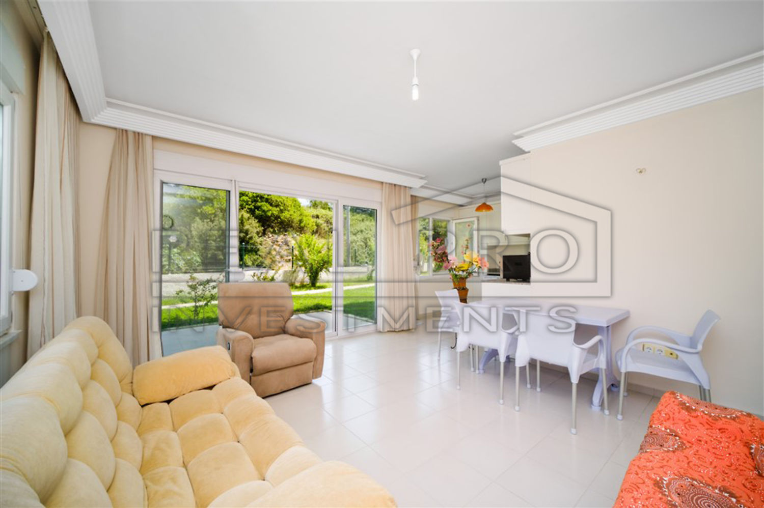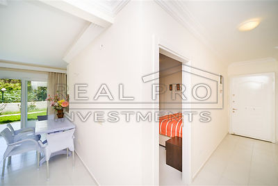 - Een comfortabele gestoffeerde bank en een beige fauteuil in de salon worden aangevuld met bijpassende gordijnen en een functionele ivoorkleurige kitchenette met een koelkast en een vaatwasser. De woonkamer heeft ook een eettafel en een klein extra bed voor eventuele gasten. De ruime slaapkamer is uitgerust met een comfortabel bed en een ruime kledingkast, de kleine schilderijen aan de muren zijn heldere accenten in het interieur. Het grote voordeel van het appartement is de toegang vanuit de woonkamer tot de tuin, waar u kunt ontbijten, traditionele theekransjes of picknicks kunt houden, een barbecue, hangmat of schommel kunt installeren en optimaal kunt genieten van de omgeving.