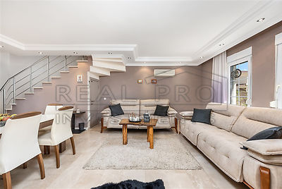 - De drie verdiepingen tellende villa heeft in totaal 3 slaapkamers en een totale woonoppervlakte van 144 m². Achter de elegante mediterrane gevel gaat een royale en goed onderhouden woning schuil. Op de entreeverdieping is er een hal met trap naar de bovenverdiepingen, een ruime woonkamer gecombineerd met een functionele keuken en toegang tot een groot terras. De woonkamer is voorzien van elegant gestoffeerd meubilair. De keuken heeft een nieuwe ruime hoekopstelling met een volledige uitrusting en een eethoek die de keuken scheidt van het zitgedeelte.