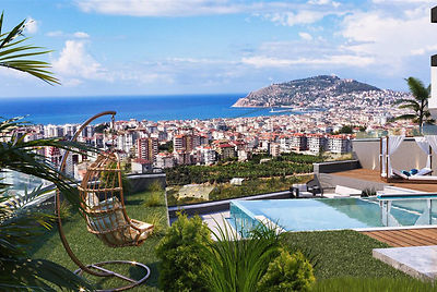 • Nieuwe exclusieve luxe villa's met privé overloop zwembad, privé Jacuzzi en privé sauna, gelegen tegen een berghelling op ongeveer 1500 meter van de Middellandse Zee in Cikcilli Alanya, Fantastisch panoramisch uitzicht over de baai en de burcht van Alanya