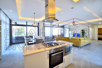 - Op de tuinverdieping bevindt zich de grote woonkamer met volledig ingerichte keuken met een kookeiland dat een stijlvolle scheiding vormt met de eethoek, de grote schuiframen zorgen voor veel lichtinval en bieden toegang tot het grote gedeeltelijk overdekte grote terras en de privé tuin met privé zwembad, op deze verdieping vinden we ook de eerste slaapkamer met badkamer en apart gastentoilet
