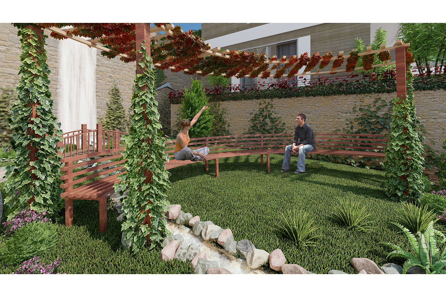 - Het concept van de residentie omvat een tropische tuin met gevarieerde aanplantingen; dus het landschap zal uit verschillende bomen en diverse subtropische struiken bestaan, en de zwembaden zullen watervallen hebben. Op het dak van elk blok zijn ruimtes voor ontspanning en zonnebaden ingericht.