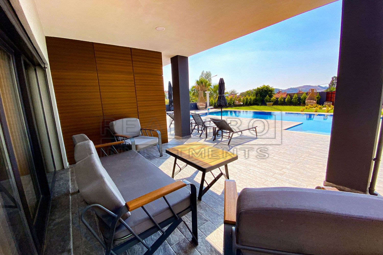 - Begane grond: grote woonkamer met eetkamer en open keuken, groot zonneterras met uitzicht op het zwembad en gastentoilet, privé tuin met privé zwembad (marmeren vloeren), oprit en buitendouche