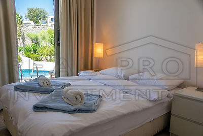 - Zeer veel lichtinval dankzij de grote schuiframen die bovendien een fantastisch uitzicht op de Egeïsche Zee bieden, 2 terrassen, travertijn vloeren, airco, master bedroom met ensuite badkamer
